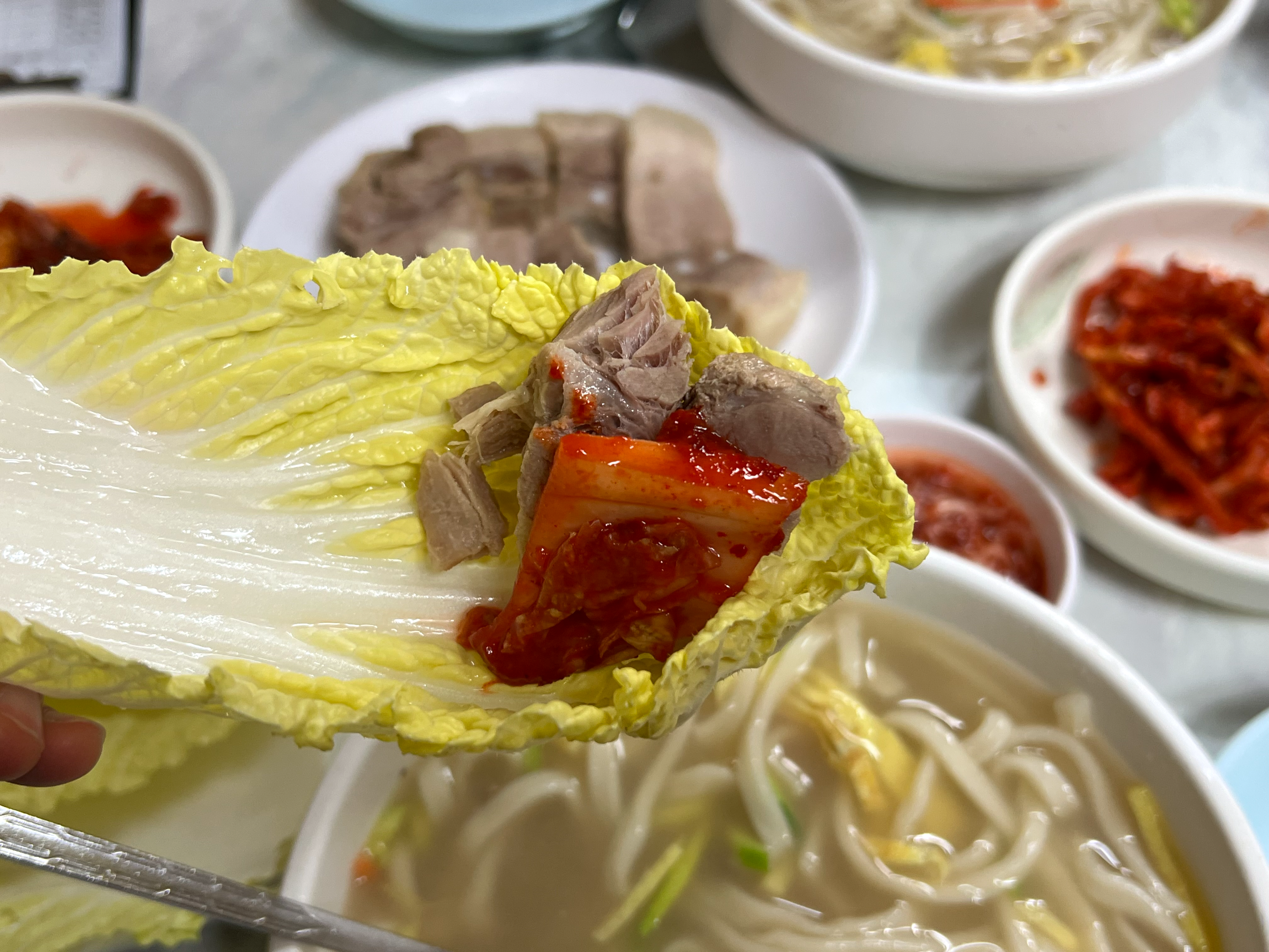 알배추에 고기 한 점, 김치랑 무채 올려서 싸 먹으면
